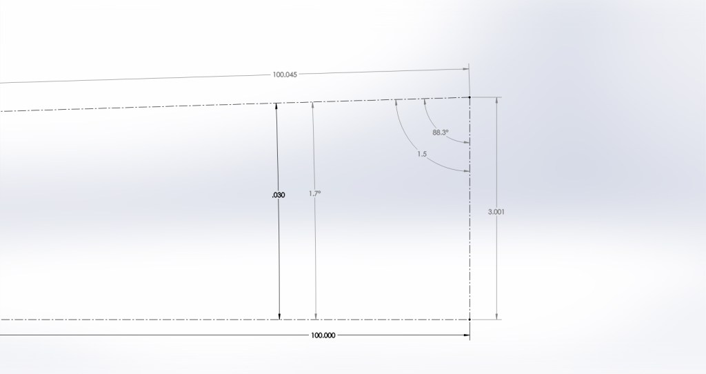 Here is one more image showing a zoomed in comparison with an angle of 30 MILS or .03 radians. At this point the vertical error assuming an arc length of 3 (100 * .03 radians) is .03%. for the comparison, 30 MIL’s equals 1.7 degrees or 102 MOA.